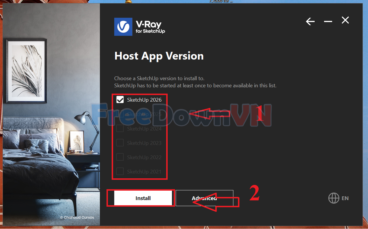 Bước 04: Chọn phiên bản SketchUp cho V-Ray ở đây mình cài bản SketchUp 2026