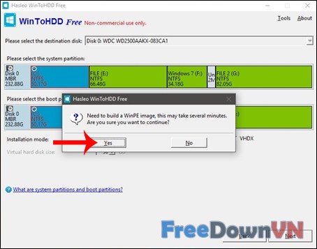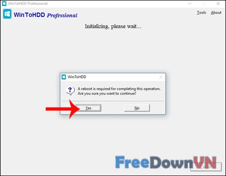 Bước 05: Tiếp đến chúng ta sẽ được hỏi có cho phép WinToHDD khởi động lại máy tính và cài đặt mới lại Win hay không, nhấn Yes để hoàn thành cài đặt lại Windows