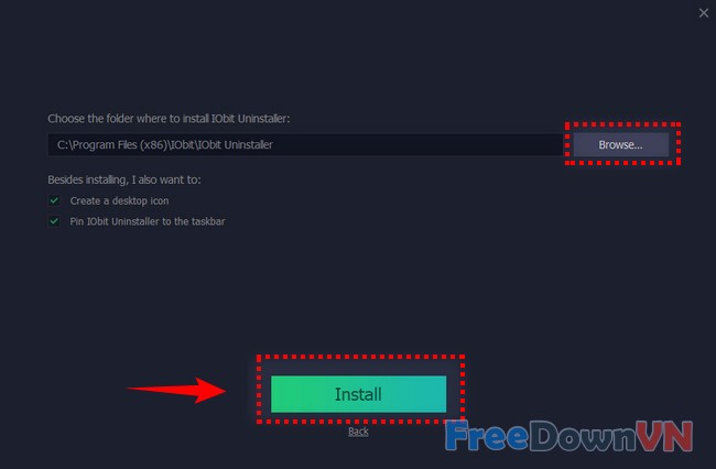 Bước 3: Bạn có thể thay đổi vị trí cài đặt IObit Uninstaller thay cho vị trí mặc định là Program Files bằng cách click vào Browse…. Ngoài ra còn có thể lựa chọn có cài đặt một icon lối tắt cho phần mềm trên màn hình desktop hay không bằng cách bỏ chọn Creat a desktop icon. Cuối cùng bạn click Install để tiếp tục