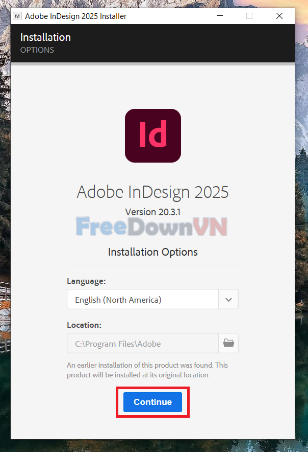 Bước 05: Nhấp Continue và đợi quá trình cài đặt Adobe InDesign 2025 hoàn thành !